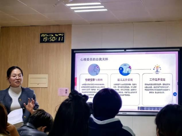 此外,培训还围绕心理健康基础知识、心理委员自我调适等内容展开,引导心理委员在助人的同时注重自我关怀,通过认知重构、时间管理、放松训练等方式,平衡学业与工作,避免替代性创伤。