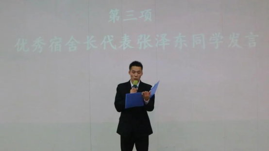 优秀舍长代表张泽东同学发言张泽东谈及了布置寝室时与舍友友好的氛围,以及注视着装扮完后的寝室的满足。干净整洁的宿舍会令人心情舒畅,充满专业特色的装扮都激励着我们学习。入学接触不久的舍友也能得以熟悉。此次活动收获满满,由柴成华老师为同学颁奖。