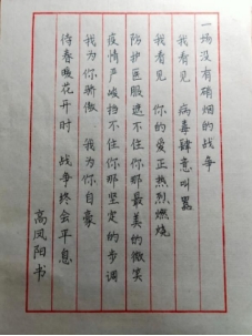 现如今,中国人民团结一致对抗疫情,我国涌现出了许多勇冲一线的医护人员、运送物资的志愿者、自愿管理封控区的楼长层长,他们每个人都在为祖国贡献自己的力量!为了致敬医护人员同时展现文字魅力,活动参与人员书写了有关内容的书法作品,一起来欣赏吧: