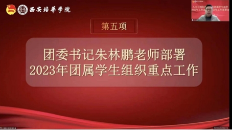 会议第五项,团委书记朱林鹏老师做总结发言。结合《共青团中央2023年工作要点》和《共青团陕西省第十三次代表大会以来工作综述》,围绕迎接本科评估工作、服务学生成长等中心工作,分别从价值引领、基础团务、主题教育、团学组织建设、第二课堂平台建设、姜维之班创建和班团一体化及其他重点专项工作做具体安排,将不断提升学院团学工作的引领力、组织力、服务力和大局贡献度,引领广大青年矢志践行“请党放心,强国有我”的铮铮誓言,培育更多优秀培华青年。