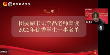 会议第三项,团委副书记李晶老师宣读2022年优秀学生干事名单,希望受表彰的干事今后立足于本职工作,更要有高标准、高要求,不断提升自我,也希望其余干事继续努力工作,向优秀干事学习。