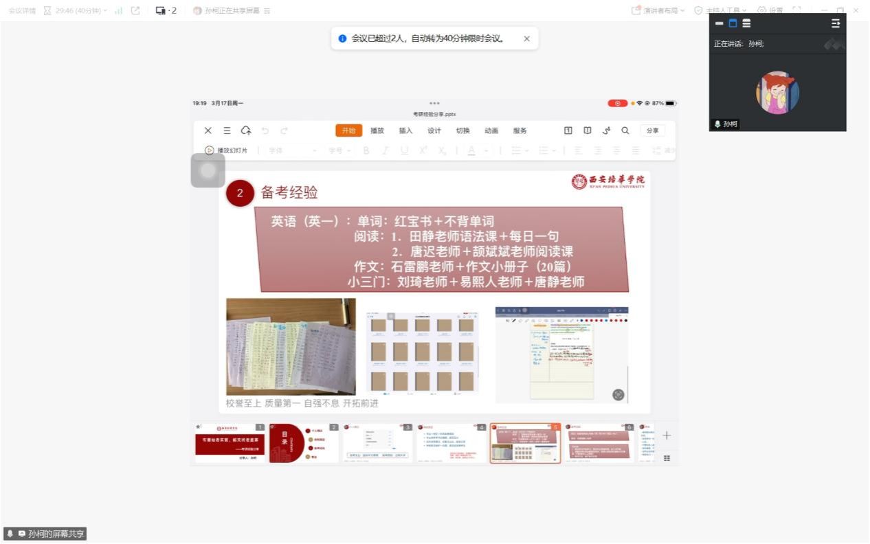 2024年3月,春回大地,万物复苏。在这充满生机与希望的季节里,人文与国际教育学院成功举办了一场别开生面的考研经验分享会。本次分享会以“上岸学姐面对面,考研路上不迷茫”为主题,邀请到两位优秀的考研成功学姐——贾尚涵和孙柯,为即将踏上考研征程的同学们带来了一场干货满满的分享盛宴。