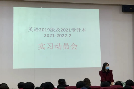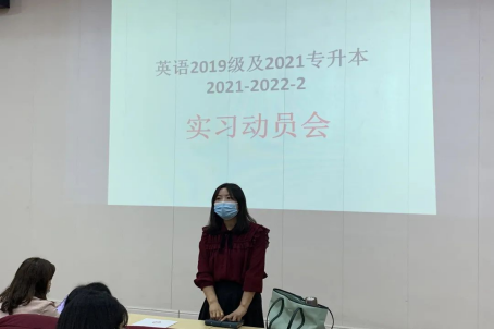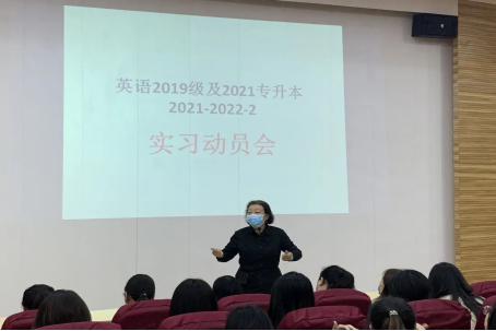 为了做好学生校外实习及安全管理工作,引导学生做好实习前的准备,5月13日中午12:20,人文与国际教育学院外语系组织2019级本科及专升本教育方向与商务方向全体学生召开了2022年学生校外集中实习动员会。会议在J102教室举行,外语系副主任周萍老师,英语专业教育方向负责人曹明教授,各班带队老师及2019级全体学生参加了此次会议。