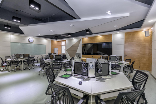 多功能数字语音实训室是为满足教学需要、推动外语专业实践实训活动、为创建特色专业创造条件而建立的一个专业训练场所。本实训室是一套软、硬件结合、功能强大、操作简便的教学系统,一共35个学生座位。主要包括:系统主控设备、系统主控软件包、计算机操作平台,学生机、DVD机和展台等。系统采用了国际先进的数字化音视频处理技术,还新增了强调个性化学习、自主式学习的学生自主学习模式。主要承担英语专业听力实训、口语实训以及商务英语、国际贸易课程的教学和实训。本实训室还配备有笔译软件,可供学生进行翻译课程的教学、实践和自主学习。室内配备有专业的录音棚,可用于翻译、配音、配乐添加字幕、后期合成、光盘刻录等活动,满足实践实训教学需要。