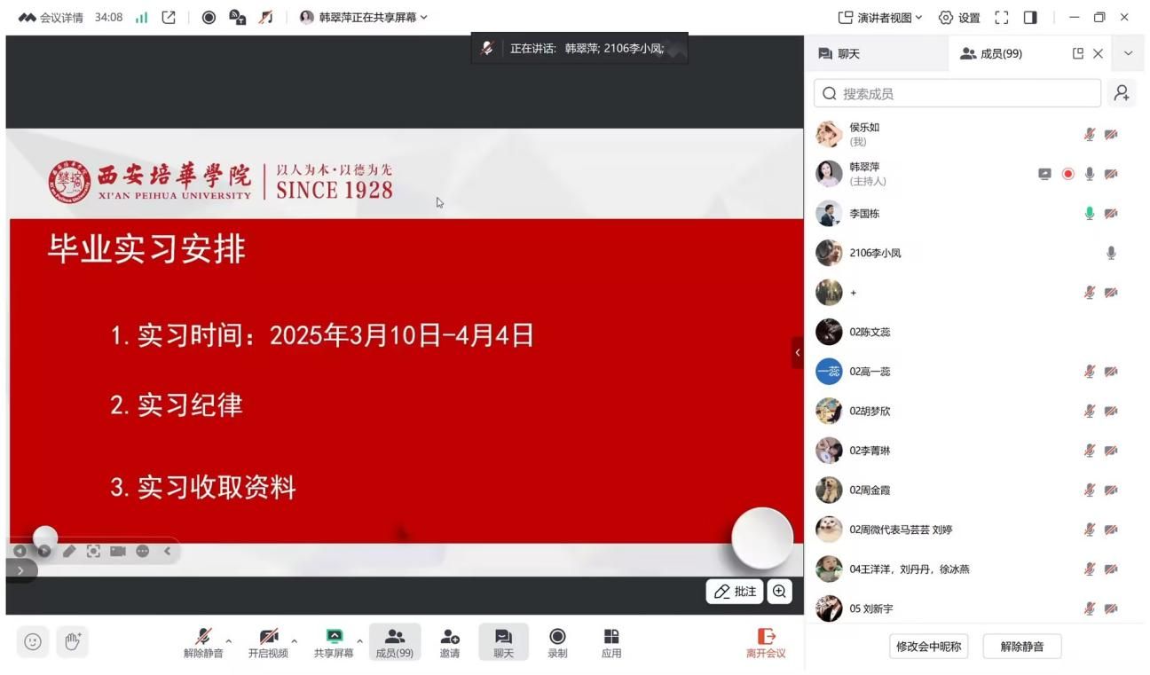 韩翠萍老师就毕业实习相关的时间安排、工作部署及实习要求做了详细介绍,并要求同学们在实习期间务必强化安全意识,严格遵守实习单位的规章制度,遇到突发情况及时与学校、实习单位沟通反馈,确保实习过程安全无虞。同时,韩老师还进一步传达了毕业实习资料的提交和整理工作的相关要求。