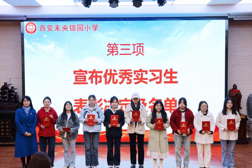 会议现场,张丽老师宣读了优秀实习生表彰决定及名单,锦园小学马校长为获奖学生颁发荣誉证书。马校长在讲话中特别提到某班级自发举办的实习生欢送班会,动情表示:“教育并非一条坦途,但你们用行动证明了实习是教育工作的美好起点。”她强调教育工作者需要终身学习,并对两校合作成效给予高度评价。