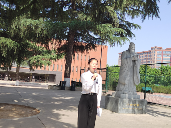 接着,由赵思梦、李佳宸同学领诵,带着50名同学在孔子雕像前齐声诵读了《大学》第一章。大家怀着朝圣之心、崇敬之情,庄严诵读经典,感悟儒家“修、齐、治、平”的理想情怀,接受中华文化精神的神圣洗礼。