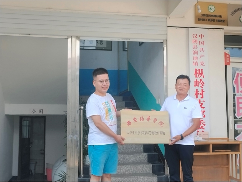 西安培华学院人文与国际教育学院团委书记朱林鹏老师与村支书罗学军进行挂牌仪式