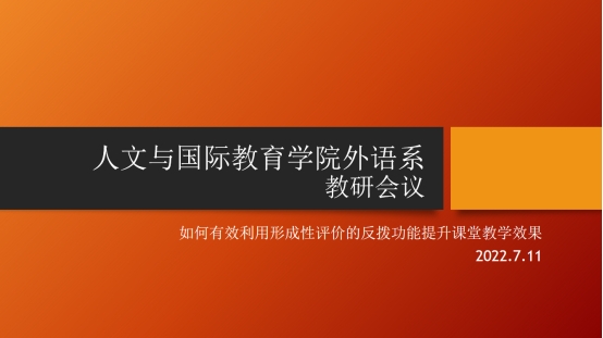 在人文与国际教育学院外语系主任胡小花主任的主持下,外语系全系老师参加了如何有效利用形成性评价的反拨功能提升课堂教学效果的教研会议。此时正值学生测试评价的收尾工作期,胡主任提出正好利用大家对于学生评价的反馈来共同探讨形成性评价的反拨功能。