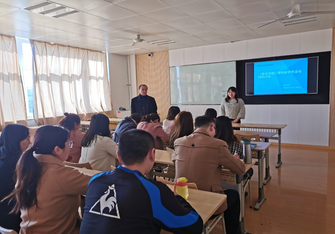 我院英语专业教研室全员18人在甘世安主任的主持下,于2020年11月18日下午13:00-14:00在1501教室召开了英语专业《英语语音》课程教学方法与经验讨论的教研会议。教研过程如下: