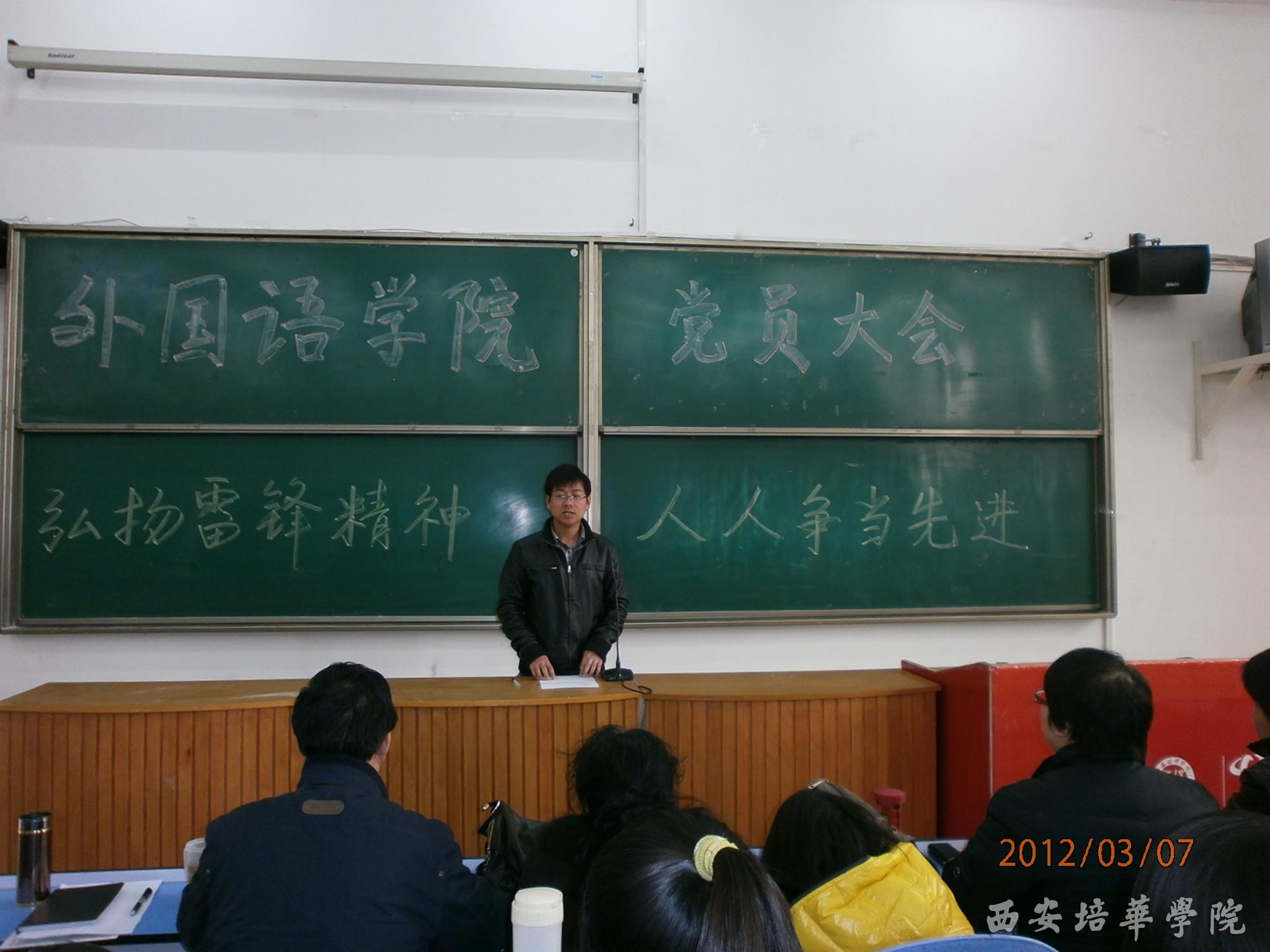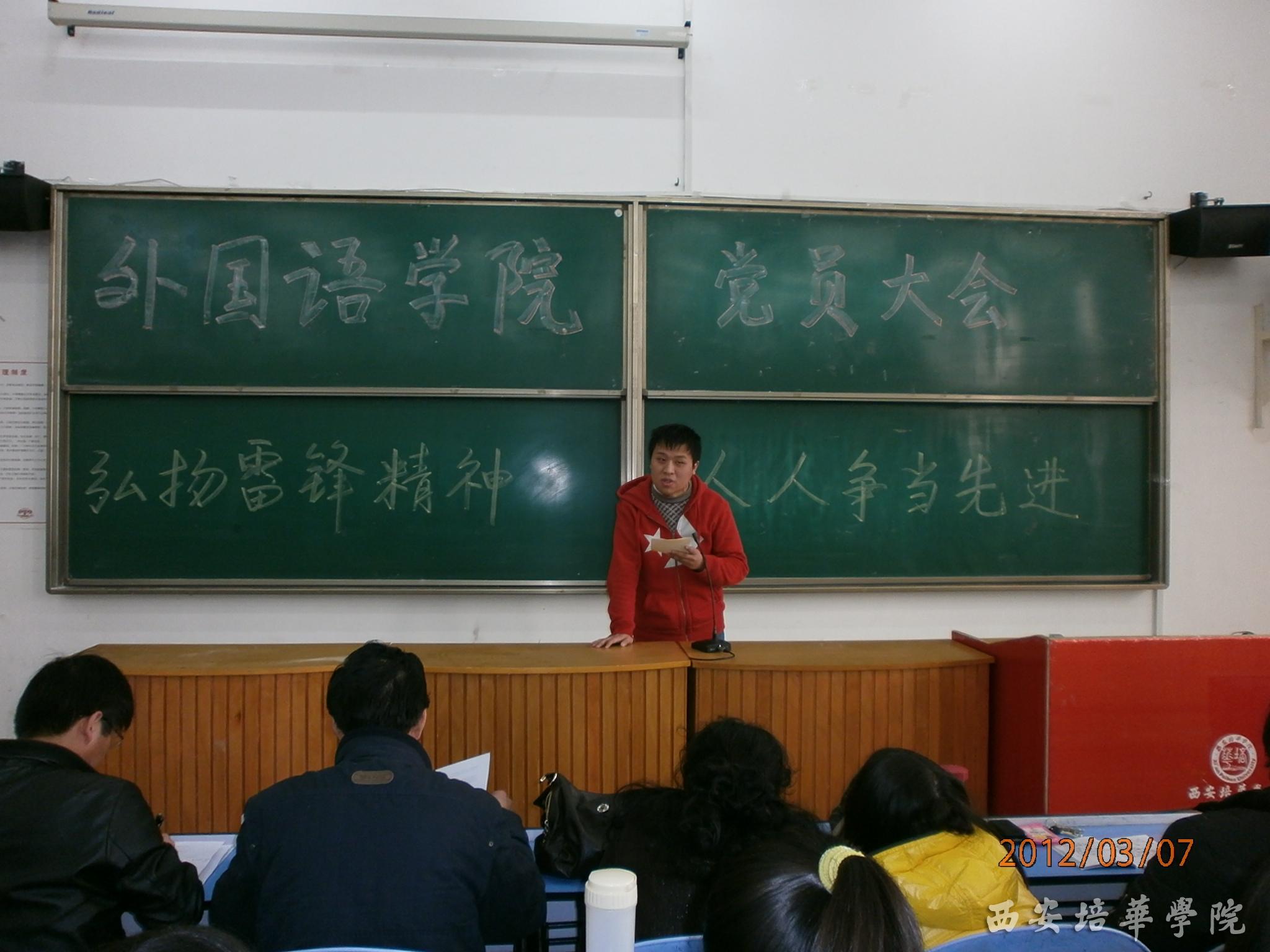 为了进一步弘扬雷锋精神,掀起积极分子、党员争先创优的高潮,外国语学院于2012年3月7日中午12:00在J101教室隆重召开“弘扬雷锋精神、人人争当先进”党员大会。会议由党总支委员、学生科长吴维东主持,院党总支副书记兼院长助理马平安老师,党总支委员陈曦 、贾卉、蔡亮以及各辅导员老师和外国语学院全体学生党员、预备党员以及低年级入党积极分子共同参加了会议。