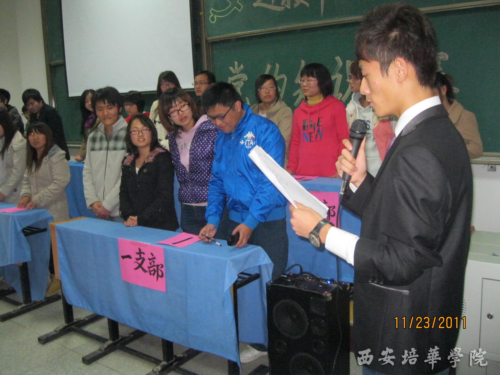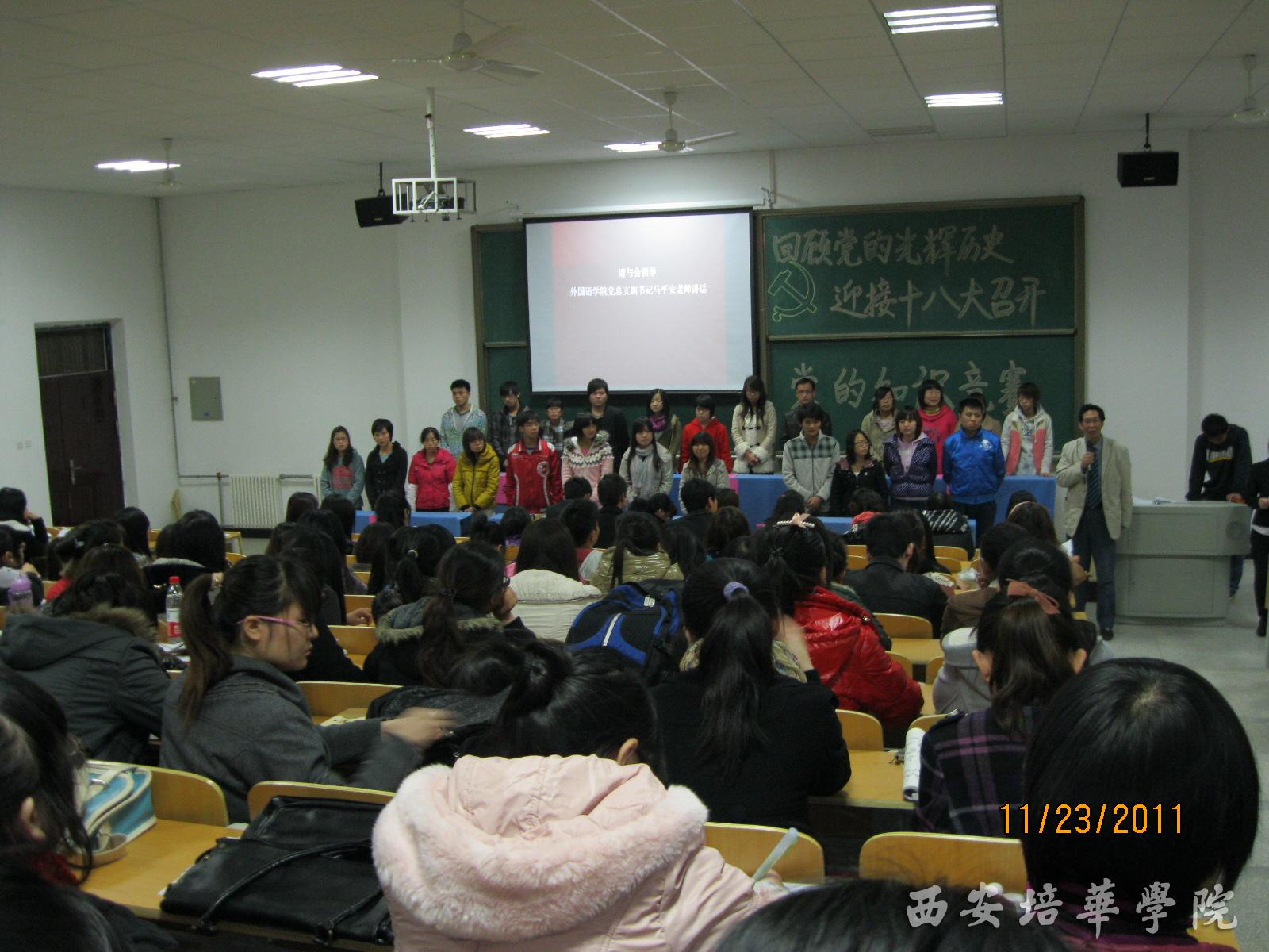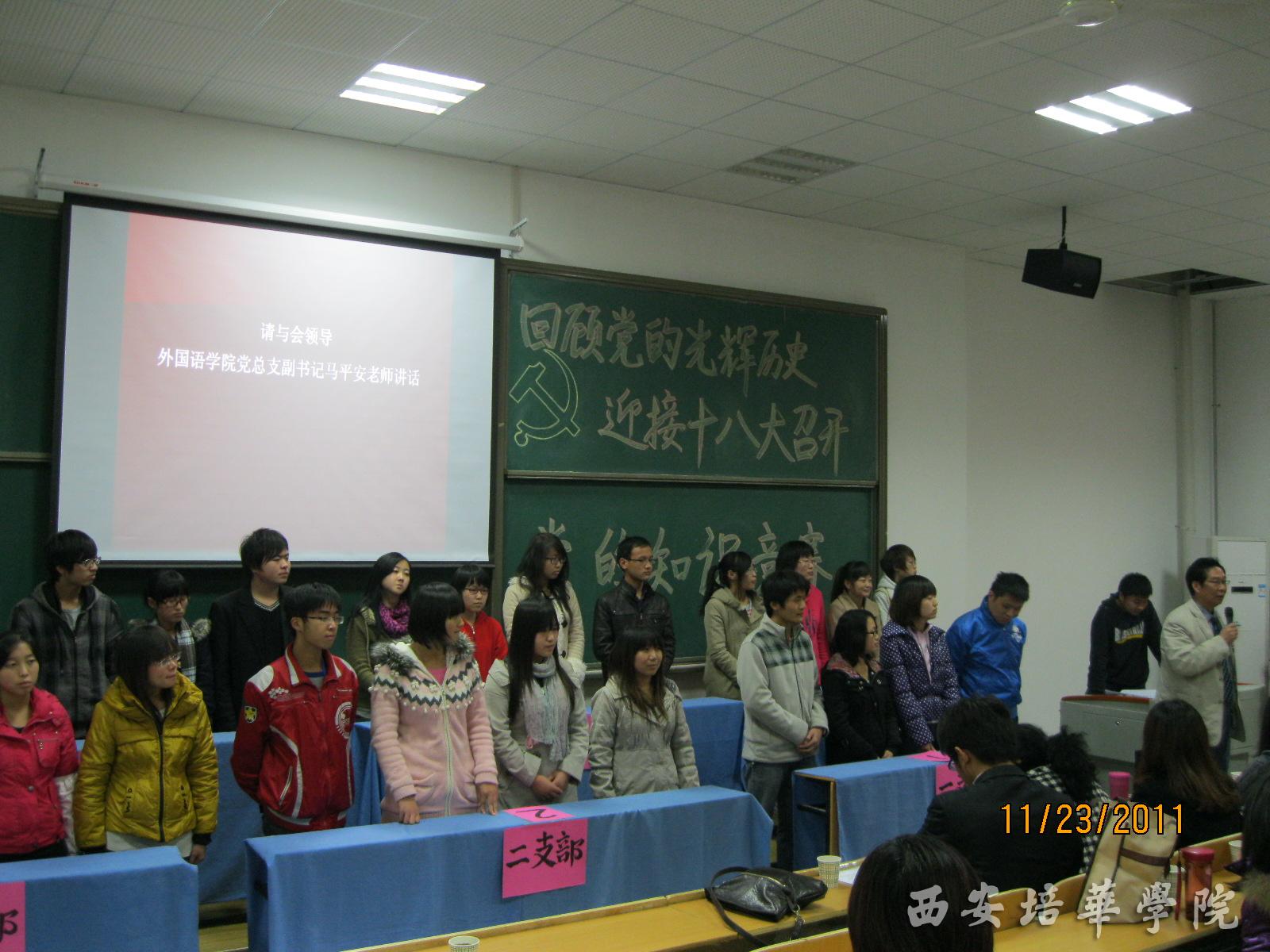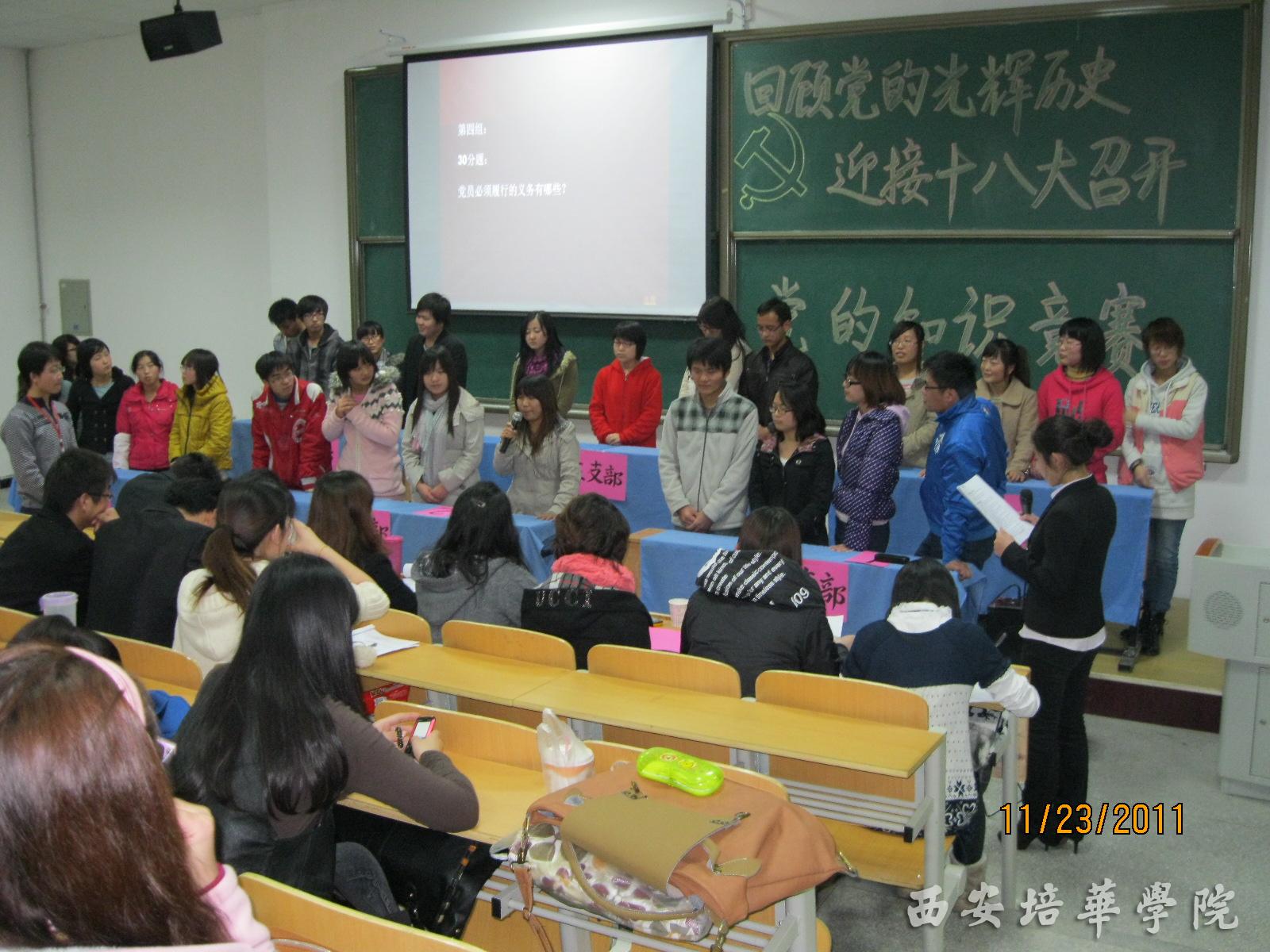 为了贯彻落实十七届五中全会精神,激发党员、入党积极分子的爱党爱国热情,推进学习型党组织建设,了解铭记党的悠久历史,继承发扬党的光辉传统。2011年11月23日下午5时30分,外国语学院 “回顾党的光辉历史,迎接十八大召开”为主题的“党的知识竞赛”在3501教室如期举行。