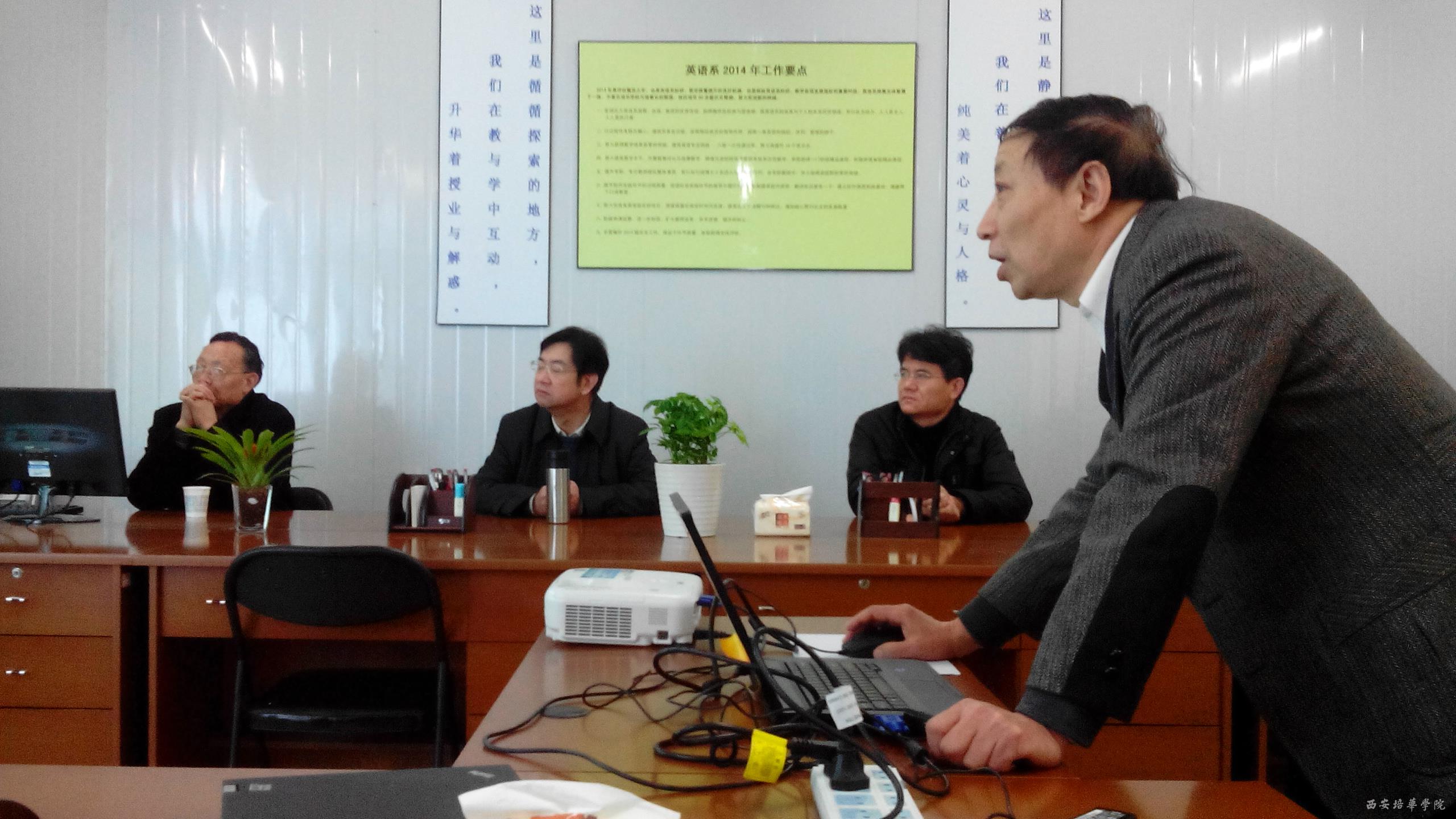 3月9日上午9点半,我校国际语言文化学院英语系、日语系《人才培养方案》论证会在英语系办公室召开。论证会邀请校外专家四人:长安大学外国语学院院长徐玉臣教授;西安翻译学院外语学院院长冯伟年教授;西安交通大学外国语学院日语系主任霍士富教授;西安外国语大学日本文化经济学院副院长毋育新教授。此外,我校副院长段茂贤、教务处处长肖建军、我院院长刘建强、教学副院长孙建中、英语系甘世安等参加了此次会议。