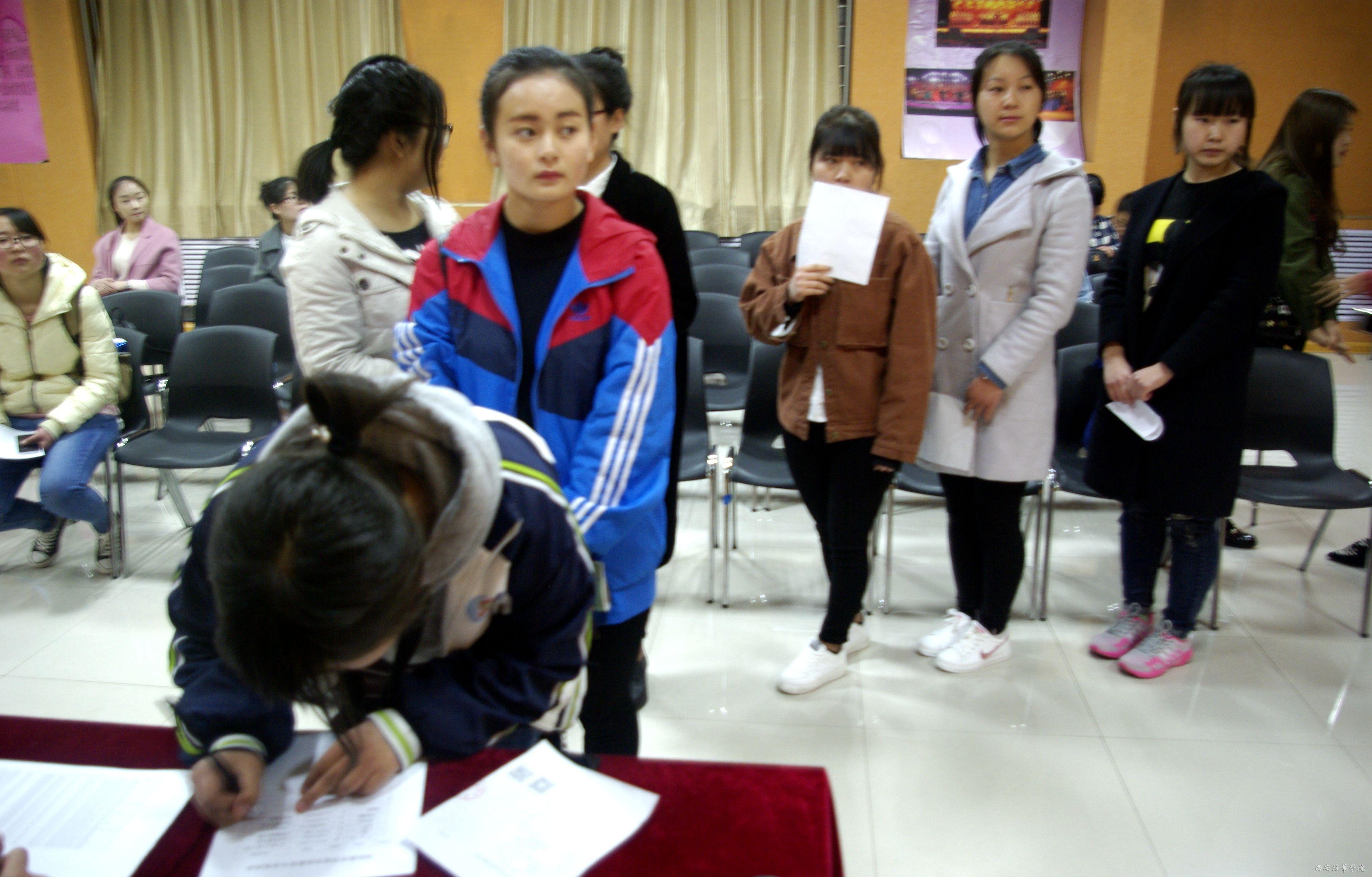 参加此次面试的考生只要是普高生和三校生。早晨九点半面试开始,在现场志愿者的引导下,很快就有几十个学生在待考室内等待面试。在待考室里,学院副院长梁蕊首先为大家就面试中应该注意的环节做了简单的讲解,并且安抚等待面试同学的紧张心情,鼓励大家在面试中,沉着应对,自由发挥。