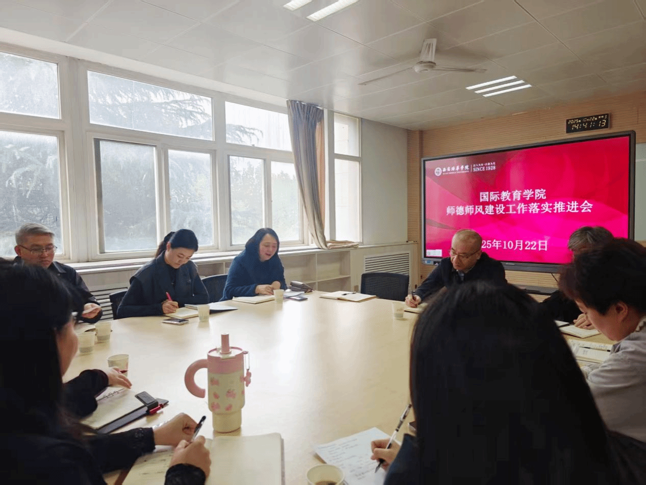 为深入贯彻落实陕西省高校学生工作视频会议精神,筑牢教师思想政治与课堂教学思想阵地,2025年10月27日上午9:00,国际教育学院在格物楼1209室,召开师德师风建设工作落实推进会。学院领导班子、各系主任、专业带头人及教职工代表参会,会议由学院党总支书记兼副院长何院长主持。