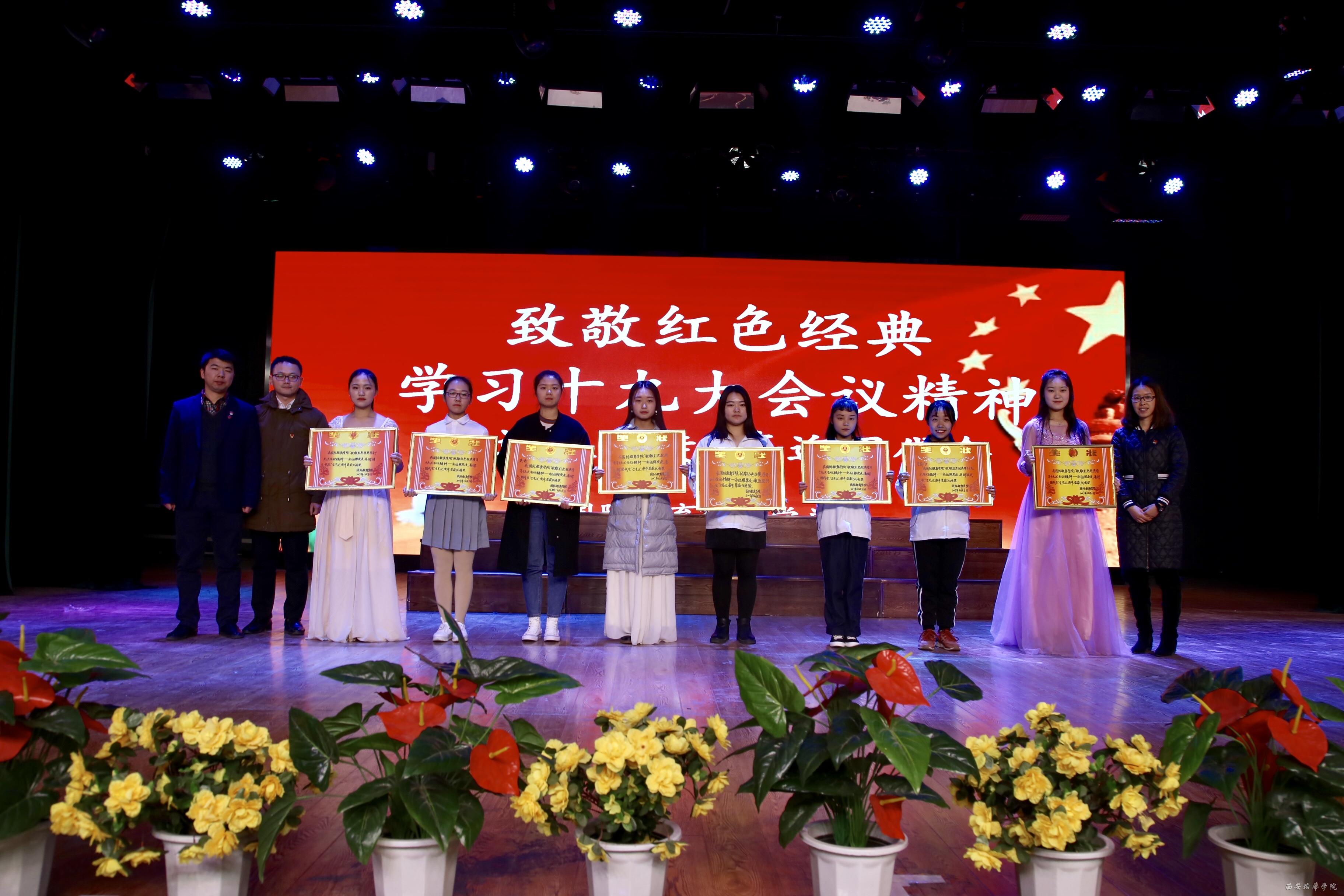 大一年级三个专业16个班级500多人通过形式多样的节目,重温红色经典,庆祝党的十九大胜利召开。其中,合唱《不忘初心》、《共筑中国梦》,朗诵《祖国啊,我亲爱的祖国》、《十九大礼赞》等节目都唱出了青年人对十九大的热情,同时也唱出了青年一代对祖国未来建设决胜的信心。英语二班—朗诵《西柏坡之歌》