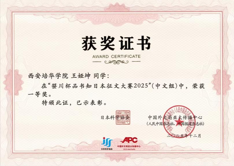 此次获奖不仅是对王娅坤同学个人专业能力与文字创作水平的肯定,也彰显了日语专业在人才培养过程中,注重学生语言能力与跨文化交际素养双提升的教学成效。未来,日语专业将继续以各类学科竞赛、文化交流活动为抓手,搭建更多实践平台,引导学生在专业学习中拓宽文化视野,提升综合素养,培养更多兼具语言能力与跨文化交流能力的复合型人才,为中日文化交流与传播贡献青春力量。