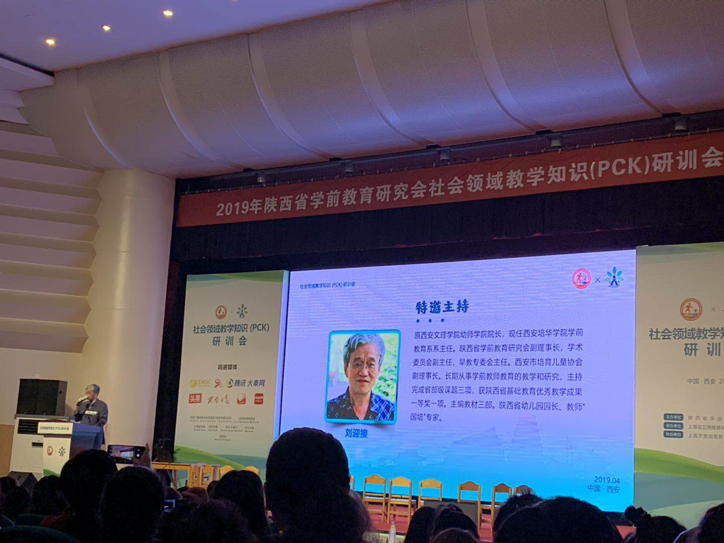 2019年4月14日9:00,研训会在碑林区边家村工人文化宫影剧院正式开幕。陕西省学前教育研究会会长吕明凯与研究会领导成员、华东师范大学教育学部黄瑾、张明红教授携数学PCK专家团队出席。参加会议的有700名幼儿园园长和骨干教师,还有我院6名学前教育专业的教师。