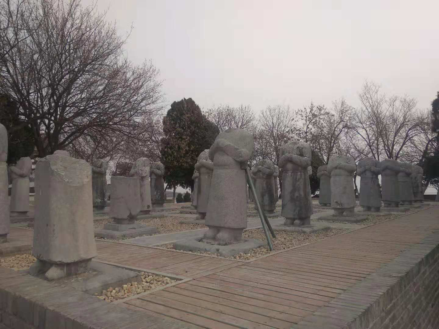 碑后两侧便是六十一番神像,令人感到惊奇的是,所有石像都没有头部,师生开始讨论:“以唐代的盛世来看,他们之间一定有少数民族或者外国使节,因为很多唐佣都会有少数民族形象,只不过为什么后来历代的人只毁掉头部,而不是毁坏全身?”导游打趣的说:“有人说这是当年日本人到此以后看到这里供奉着自己模样的石像,一气之下便将所有石像脑袋全部砍下。事实上这些石像绝大多数都毁于明清的战乱。