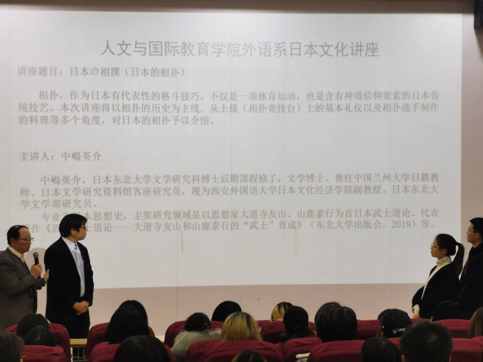12月12日下午,我院外语系日语专业在格物楼J101教室举行了一场题为“日本の相撲(日本的相扑)”的日本文化讲座。主讲人是应邀前来的西安外国语大学日本文化经济学院副教授中嶋英介博士。讲座由刘建强教授主持,大四年级张佳唯和林俊胜同学担任现场翻译。