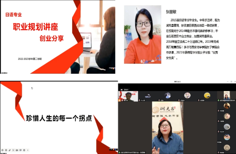 人文与国际教育学院外语系日语专业分别于2022年12月12日19:00—21:00,和13日19:00—21:00在腾讯会议平台召开了两场职业规划云端系列讲座。这两场次讲座的主讲人分别为日语专业15届毕业生张丽敏经理和17届在日工作的毕业生陈蕾女士。参加本次讲座的是日语专业的教师和21级至19级的同学们。