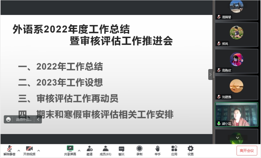 2023年1月3日下午,外语系于线上召开2022年度工作总结暨审核评估推进会。外语系主任胡小花副教授、副主任曹长春副教授、副主任周萍老师、大学英语课程负责人贾梦琦老师及外语系全体教师参加会议。外语系副主任曹长春副教授主持会议。