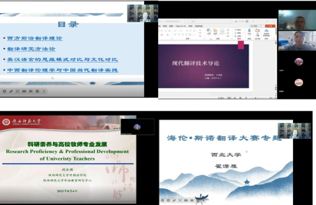 本次研修班自2023年7月28日至8月4日于线上举办,课程包括陕西省翻译协会胡宗峰教授讲解的《文学大省的文学翻译》,西安外国语大学黄立波副教授主讲的《语料库翻译学》,西北大学杨柳副教授主讲的《中华典籍英译教学与实践》,西北大学成天娥教授主讲的《翻译理论与技巧》,西北大学翟潇雁副教授主讲的《翻译研究理论与方法》和《海伦斯诺翻译大赛赛题研究》,西北工业大学王均松副教授主讲的《现代翻译技术教学与实践》,陕西师范大学刘全国教授主讲的《研究素养与高校外语教师专业发展》等翻译主干课程。8位主讲教师主要围绕文学翻译、语料库翻译学、翻译理论与技巧、翻译技术的运用与前景、领袖著作与翻译大赛等翻译行业前沿话题开展了专题论坛,课程内容丰富全面,课程设置多元,教学方式新颖。本次培训覆盖范围广泛,满足了学员教师们的多元学习需求,有助于提高学员教师们的翻译素养及专业教学能力。