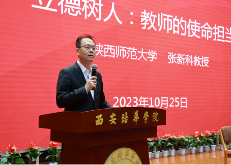 2023年10月25日14:30,由教师教学发展中心、党委教师工作部和人文与国际教育学院共同举办的西安培华学院95周年校庆系列活动之培华大讲堂在维之图书馆顺利拉开帷幕,此次讲座特邀教育部全国高校黄大年式教师团队负责人、长江学者、陕西省教书育人楷模、陕西师范大学文学院教授、博士生导师张新科教授,作“立德树人:教师的使命担当”主题讲座。西安培华学院理事长姜波博士、西安培华学院校长李映方教授、西安培华学院副校长刘越莲教授以及各二级学院领导出席了讲座,四百名教师代表参加了讲座。讲座由西安培华学院副校长刘越莲教授主持。