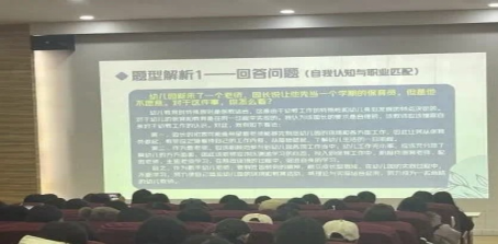 指导老师们从学前专业文件、教师职业发展解读的解读及幼儿园教师资格证考试培训等方面为学生们提供了一系列的指导和建议。为了使同学们更好的理解职业规划,培训将职业规划分成了三大步骤:第一步、自我认识,学习理论;第二步、职业评估,学习技能;第三步、职业定位,人职匹配;指导老师详尽地讲解了每一步,并结合实际向同学们阐释了原理。