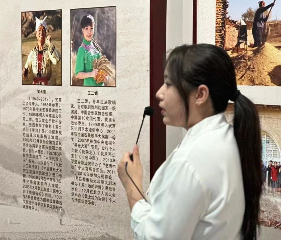 与此同时,志愿服务队一行来到了安塞民歌展览区。据讲解员介绍,安塞涌现出了众多新秀歌手,如洋芋疙瘩、王二妮等著名的安塞民歌歌手,他们通过《星光大道》节目走红,将安塞民歌的知名度推向大江南北。听闻此处,志愿服务队成员不禁感慨,安塞民歌不仅见证了陕北人民的生活变迁和精神风貌,更为推动中华优秀传统文化做出了积极贡献。