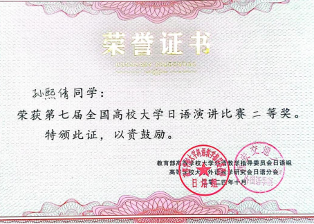 10月18-19日,由高等学校大学外语教学研究会日语分会、教育部高等学校大学外语教学指导委员会日语组主办的“第七届全国高校大学日语演讲比赛”在重庆西南大学举行。经过预赛选拔参赛校有北京师范大学、复旦大学、中山大学、上海对外经贸大学等35所高校。在决赛会场,我校孙熙倩同学凭借出色的表现荣获二等奖。这一成绩的取得,不仅是对孙熙倩同学个人努力的肯定,也是对我校大学日语教学水平的认可。