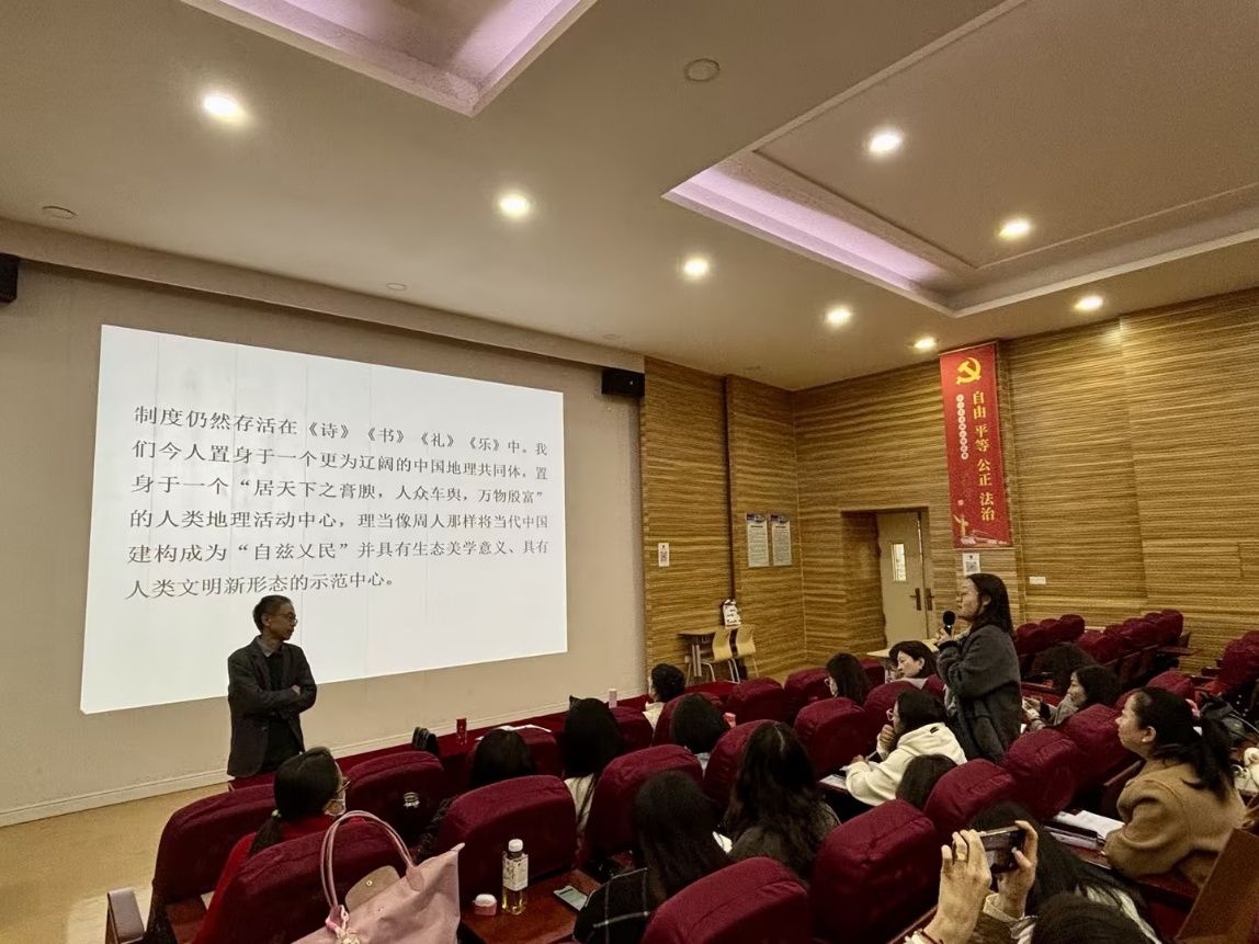 接着,程院长引经据典,从时空两个维度、三个层面对此进行详细阐释:从黄帝到武王:中国最初地理共同体的确立与居“天下之中”意识的形成;农耕传统与井田制仁政实践:周人发现中国、“自兹乂民”的深层原因;何为中国:周“宅兹中国,自兹乂民”的文学证明。