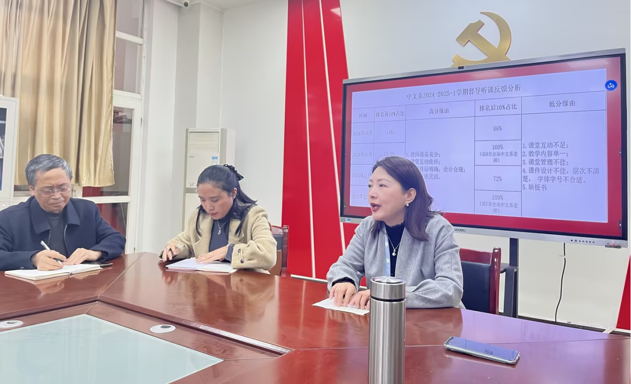本次会议聚焦教学问题,分享经验,为青年教师的专业成长提供了有力指导。会议伊始,朱红梅副教授对督导听课过程中发现的问题进行了全面分析。她指出,当前中文系青年教师在教学能力方面存在不足,提升教学能力已迫在眉睫。