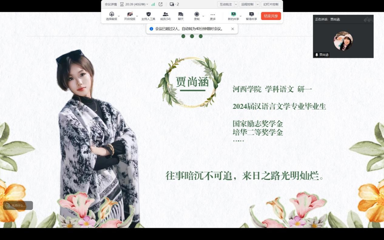 分享会由主持人管园园老师开场,他首先对两位学姐的到来表示热烈欢迎,并简要介绍了她们的背景与成就。贾尚涵学姐现就读于河西学院学科语文专业研一,曾在校期间荣获国家励志奖学金、培华奖学金等多项荣誉;孙柯学姐则就读于云南大学国际中文教育专业研一,曾在校期间获得专业类职业技能大赛优秀奖等多项荣誉。两位学姐在2024年的考研战役中披荆斩棘,成功上岸,她们的宝贵经验无疑为即将考研的同学们提供了重要的参考与指导。