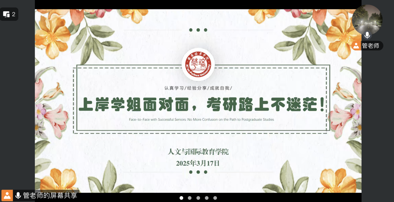 2024年3月,春回大地,万物复苏。在这充满生机与希望的季节里,人文与国际教育学院成功举办了一场别开生面的考研经验分享会。本次分享会以“上岸学姐面对面,考研路上不迷茫”为主题,邀请到两位优秀的考研成功学姐——贾尚涵和孙柯,为即将踏上考研征程的同学们带来了一场干货满满的分享盛宴。