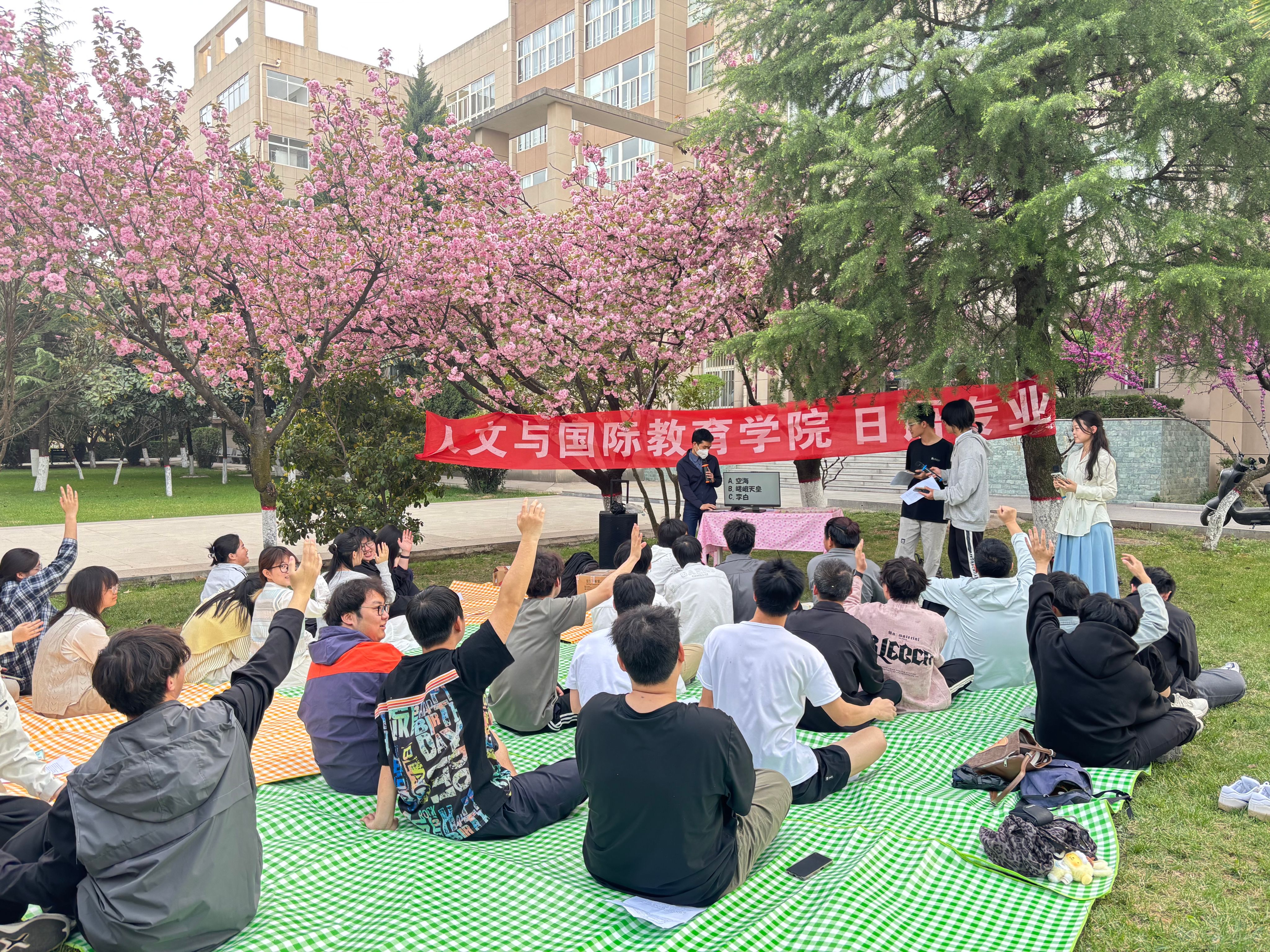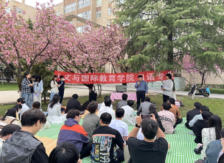 2025年4月9日下午,外语系日语专业师生在校园中举办"樱花课堂"课外实践活动,沉浸式体验探索了日本樱花文化的深层意蕴,本次活动由外语系主任李国栋教授作开场致辞。