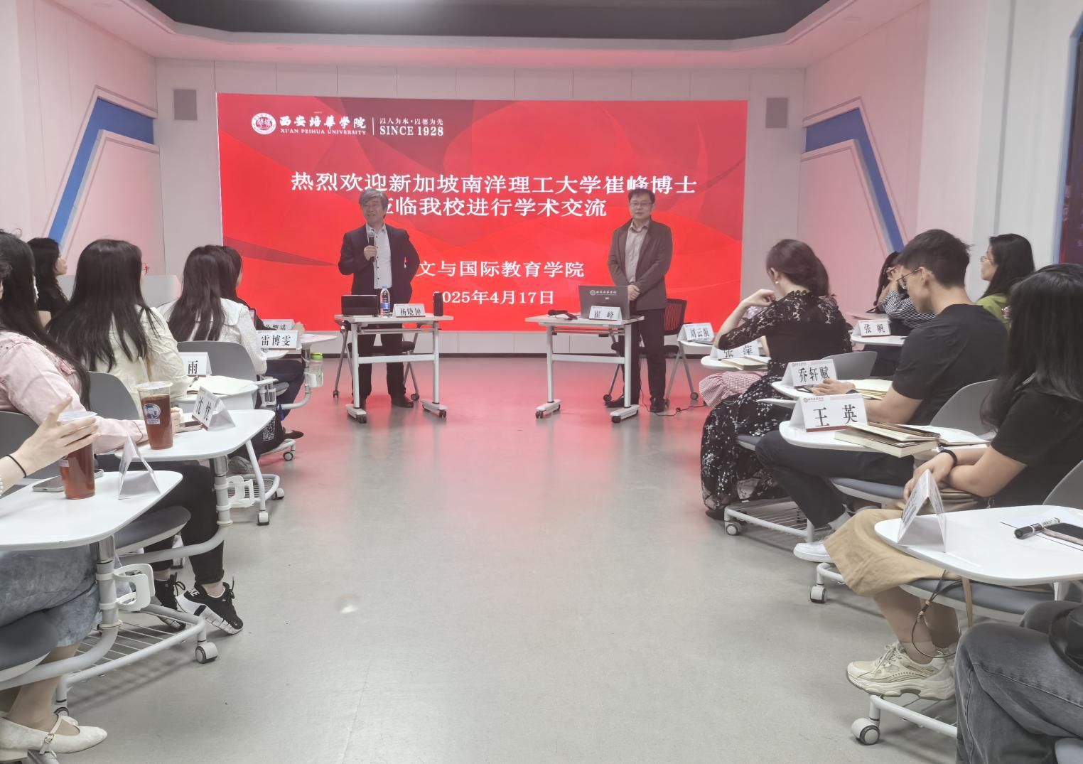 为助力我校教师拓宽国际学术视野,深化海外深造与访学认知,由人文与国际教育学院主办的"海外深造、访学与国际学术交流经验分享—以南洋理工大学人文学科为例"学术工作坊于2025年4月17日上午在格物楼VR实验室圆满举行。本次工作坊特邀国际知名学者崔峰博士担任主讲嘉宾,以其丰富的海外教学与科研经历,为现场来自学院各系的教师代表带来了一场干货满满的学术盛宴。