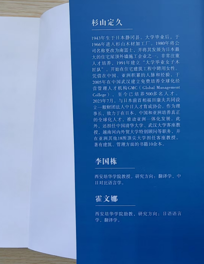 杉山定久先生作为该书原著作者,现任日中人才育成协会理事长,并受聘担任西安培华学院客座教授。他曾两度应邀莅临我校开展学术交流,期间面向师生发表专题报告,为深化中日教育合作作出积极贡献。
