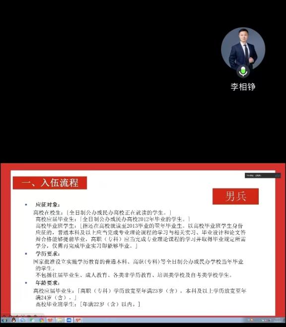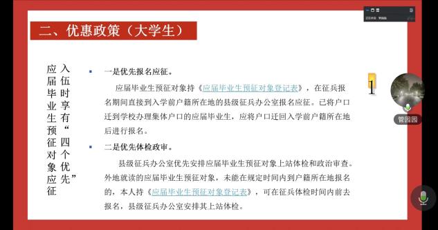 此次线上宣讲会让每一位大四毕业生都能足不出户,通过屏幕与辅导员“面对面”交流。辅导员们化身政策解读的“导航员”,从报名登记的每一个时间节点,到体检政审的具体标准;从服役期间的优抚待遇,到学费代偿的核算方式,每一个环节都讲解得细致入微。真正实现了征兵政策“应知尽知、应会尽会”的初衷,丰富了毕业生的就业选项。