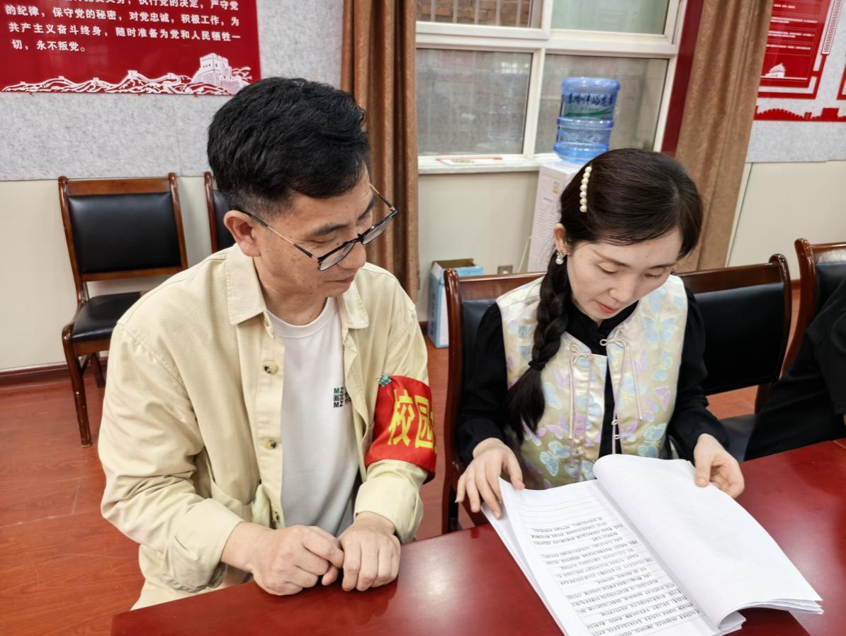 周东良主任和张萍主任翻阅上一批实习生的工作记录