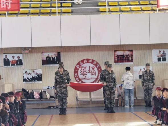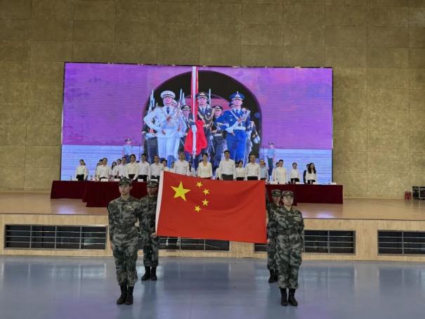 国旗护卫队队员身着整齐制服,迈着铿锵正步托举红旗步入典礼现场。全体师生即刻肃立,向国旗行注目礼,此时,激昂的《义勇军进行曲》旋律奏响,师生们齐声高唱,嘹亮的歌声与肃穆的氛围交织萦绕全场。