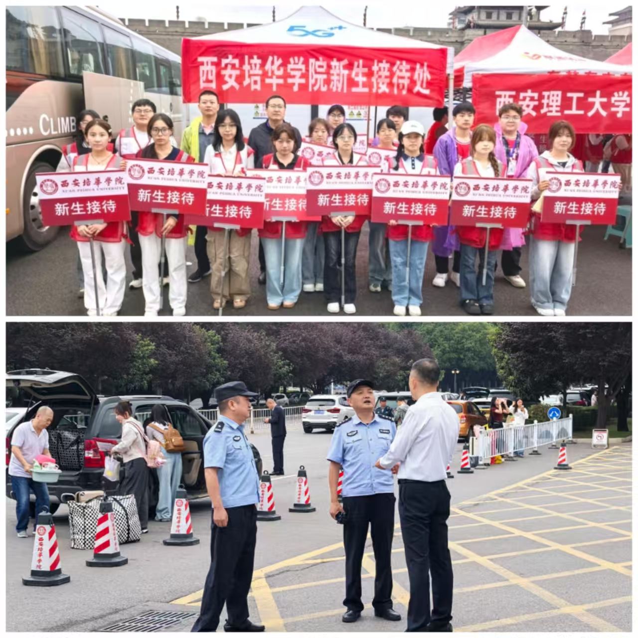 秩序与安全维护多方联动。报到当天协调长安区交通、城管、公安部门,规划校外车辆停放区域,安保组全体工作人员共同维护校内外秩序,保障新生及家长人身和财务安全。校车队安排火车站、高铁站、地铁口接待车辆,确保 24 小时新生接送顺畅。