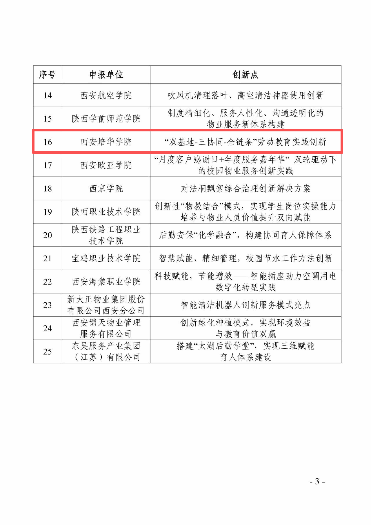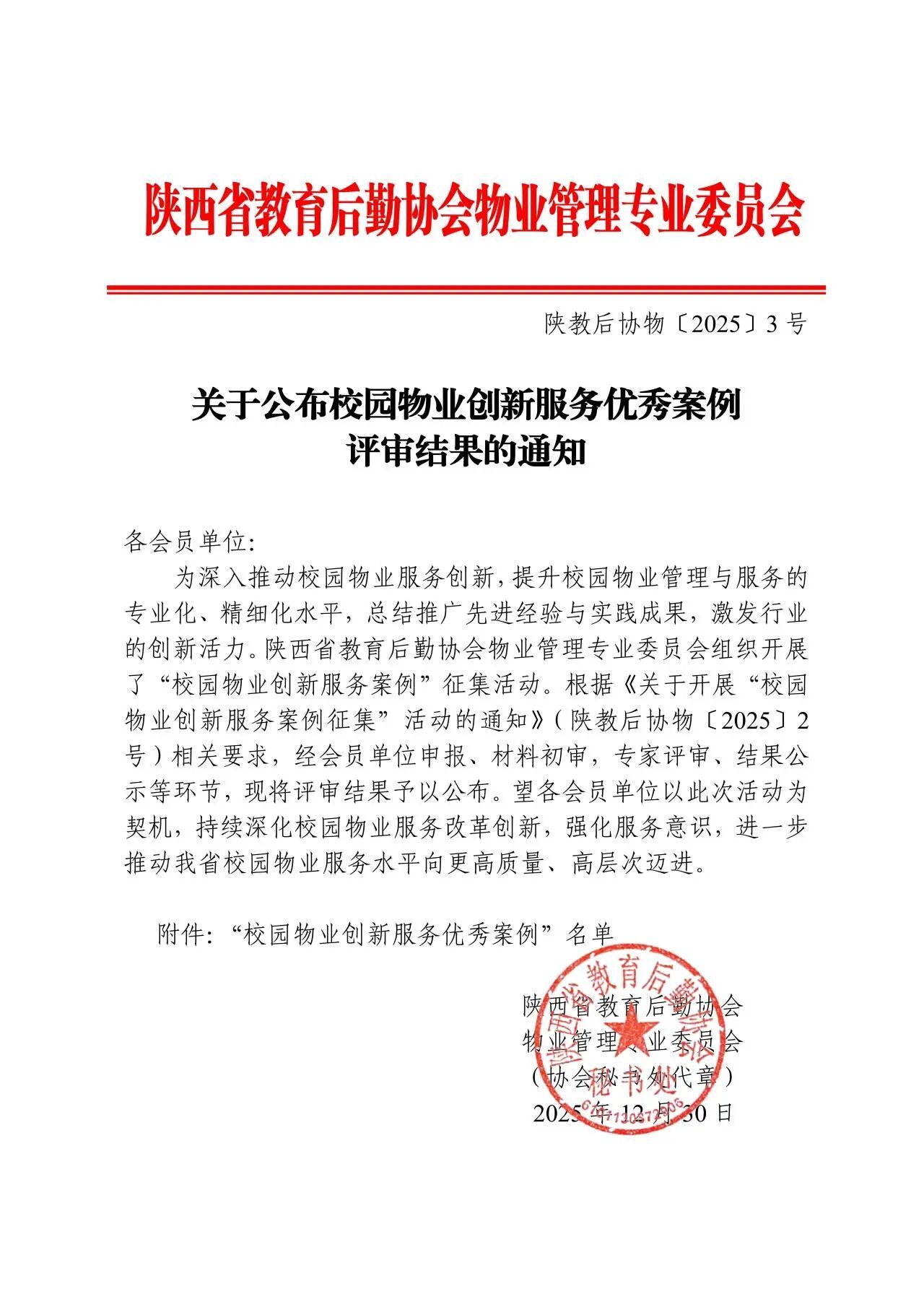 近日,陕西省教育后勤协会公布校园物业创新服务优秀案例评审结果,学校后勤服务中心报送的“双基地-三协同-全链条”劳动教育实践创新案例经初审、复审、终审后成功入选,荣获省级校园物业创新服务优秀案例称号。
