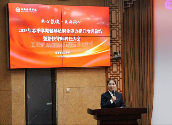为进一步加强学校辅导员队伍建设,夯实新入职辅导员的业务培训和理论提升,促进新入职辅导员快速熟悉大学生思想政治教育政策、规律和方法,帮助新入职辅导员深入了解岗位职责和任务目标,3月14日,在汇知楼国学大讲堂举行了“西安培华学院 2025 年春季学期辅导员职业能力提升培训总结暨帮扶导师聘任大会”。校党委副书记、副校长姚文静,党委学工部部长权勇太,校团委书记董莹,各二级学院党委(党总支)书记、副书记,全体辅导员参加了此次大会。大会由学工部副部长杨媛主持。