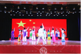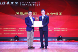 李颖副教授、韩晓勇副教授、副主席陈大明教授、周伟教授、侯颉副教授、柏正杰副教授、姜波理事长、李映方校长、姚文静副校长为凤凰舞蹈团、恒友合唱团揭牌。