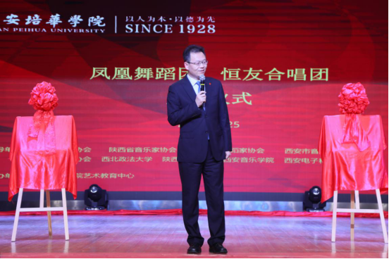 姜波理事长致辞,他讲到,恒友合唱团和凤凰舞蹈团在成立之前就有着独特的校园风采,不仅绽放在校内外的各大舞台上,更绽放在今天这个充满青春活力的舞台上。恒友之名意义深远,不仅代表永恒的朋友,更是用父亲姜哲先生的字纪念培华几代人的心血和青春。他宣布西安培华学院凤凰舞蹈团、恒友合唱团正式成立,希望今后能为恒友而歌,像凤凰般舞,走向更丰富、更广阔的人生大舞台。