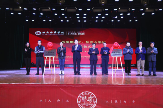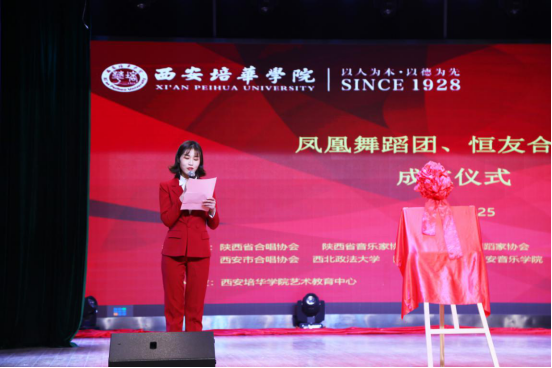11月25日,西安培华学院凤凰舞蹈团、恒友合唱团成立仪式在大学生活动中心举行。陕西舞蹈家协会副主席、西安音乐学院舞蹈系主任李颖副教授,陕西省舞蹈家协会副秘书长、陕西师范大学音乐学院副院长舞蹈系主任韩晓勇副教授,著名作曲家、西安音乐学院二级教授、陕西省教学名师、西安市音乐家协会副主席陈大明教授,中国高教学会音乐教育专业委员会副理事长、中国合唱协会理事、陕西省音协理事、陕西省合唱协会副会长、西安电子科技大学周伟教授,著名指挥家、西安音乐学院教务处长侯颉副教授,西安市合唱协会副会长、西北政法大学柏正杰副教授,西安培华学院理事长姜波博士,李映方校长,姚文静副校长、二级院部负责人及学生200余人参加。