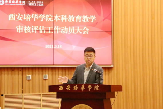 校长李映方作动员讲话。他指出,学校发展已经站在了新的历史起点上,正处在跨越式发展的关键期,全校上下要凝心聚力,务实笃行,为建设推进本科教育高质量发展而努力。针对评建工作,他提出明确要求:一是统一思想,认真学习把握审核评估精神实质。二是从师德师风、教学管理、学生管理、工作作风等方面扎实做好学校审核评估工作。三是要树立全局意识,强化责任落实,处理好学校顶层设计与评建工作的关系,多规合一、一张蓝图。李校长强调,当前和今后一个时期,是我校全面开启高水平民办大学建设新征程的关键时期,希望各单位以勇于担当的责任感和使命感,将审核评估各项目标任务落到实处,写好“十四五”开官之笔。