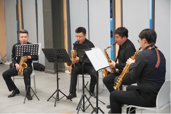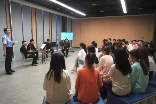 活动邀请了来自西安音乐学院、西安高新国际学校等单位的音乐教师陈则庆、马贝利和郑憾三位青年萨克斯演奏家作为嘉宾。艺术教育中心专业教师宋亚平老师通过与三位嘉宾合奏、互动等形式,为大家带来了一场别开生面的音乐艺术盛宴。