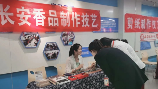 在博远楼一楼大厅向大家展示了的来自长安区文化馆的非遗代表展,优美的陶勋、精致的石砚、活灵活现的糖人、沁人心脾的长安香品等六项非遗展品让同学们对我国非物质文化遗产有了更深一步的了解。